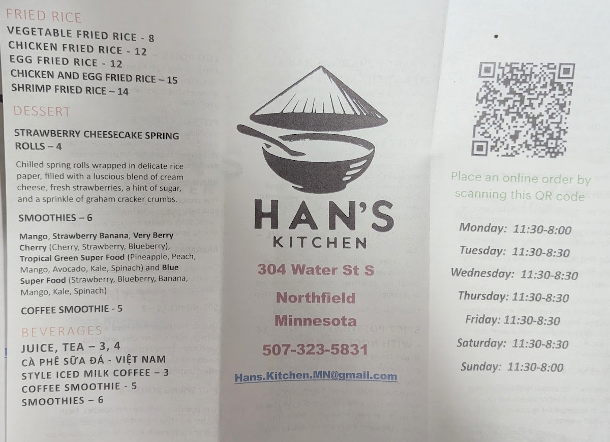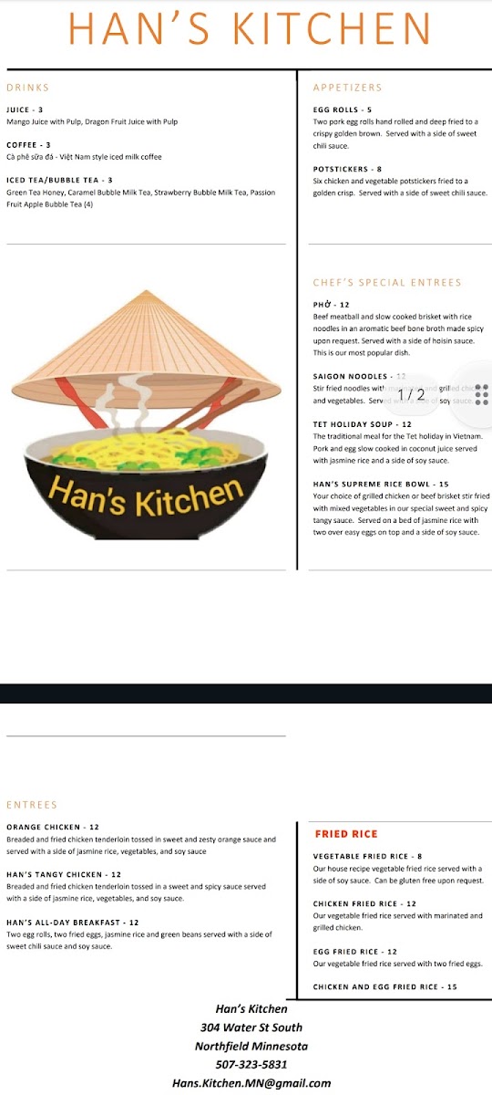 Welcome to Han's Kitchen, a delightful culinary hidden gem located at 304 Water St S, Northfield, MN. This cozy eatery offers a vibrant menu that combines traditional Vietnamese flavors with creative twists.